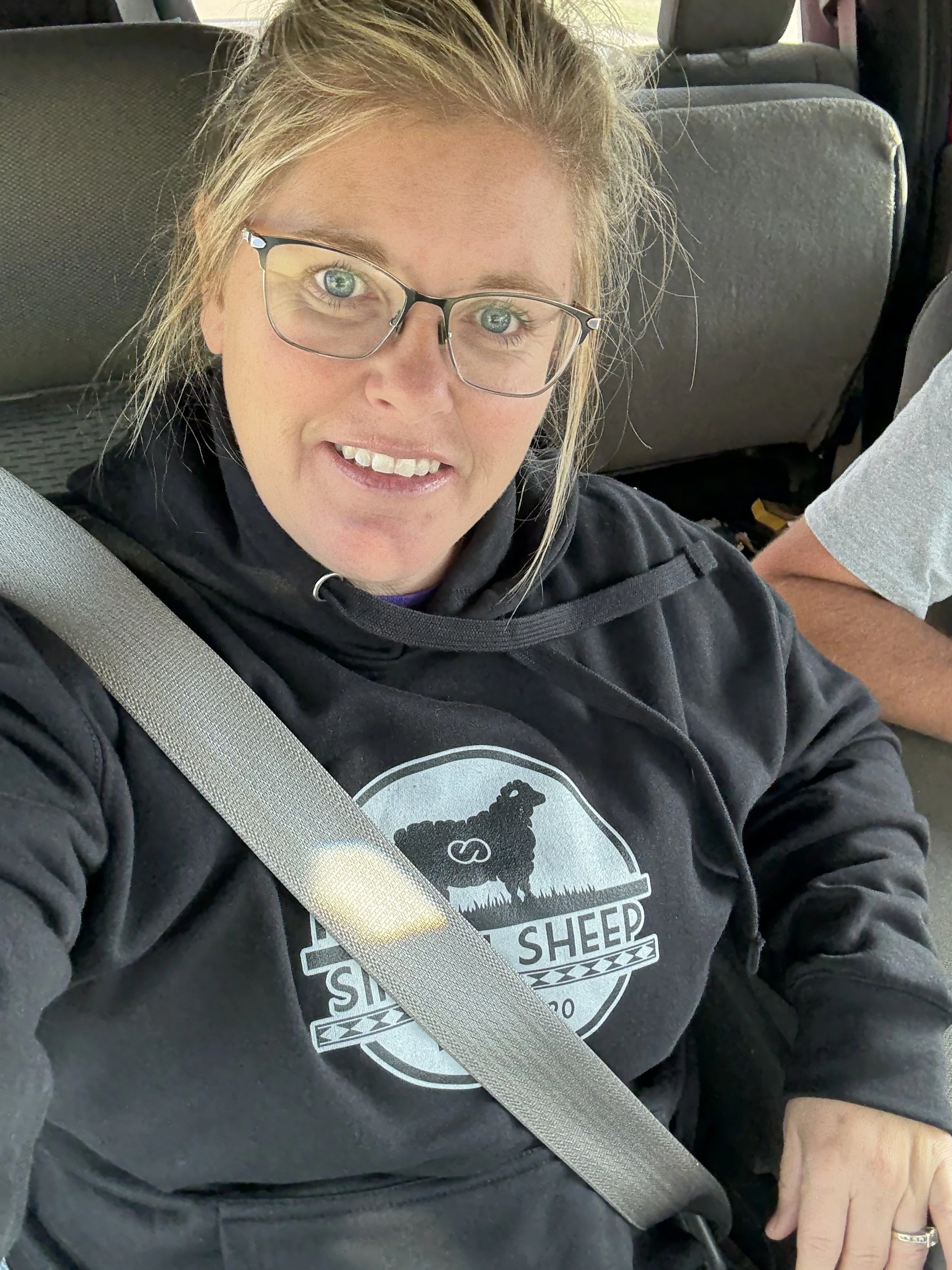 Ok, when I first did our website a few months ago, I ordered a Simon Sheep t-shirt for me and one for Stephen and a polo for him as well. I am finally getting around to ordering some gear for my kids and my in-laws today! A few of you have ordered from us already- my brother in Topeka, my dad in Quinter, a cousin in Texas who will wear his hat “with pride” and a friend from Wakeeney. This picture is Jessica and she LOVES sheep. She has bought one from us (named Simon), has worked with them for years, and proudly supports our farm! I met her when she taught in Quinter a few years ago and we had a ton in common and hit it off! We even got our mini donkey from her we named Howard after her. Thanks Jessica for showing your support and wearing our hoodie out and about!
